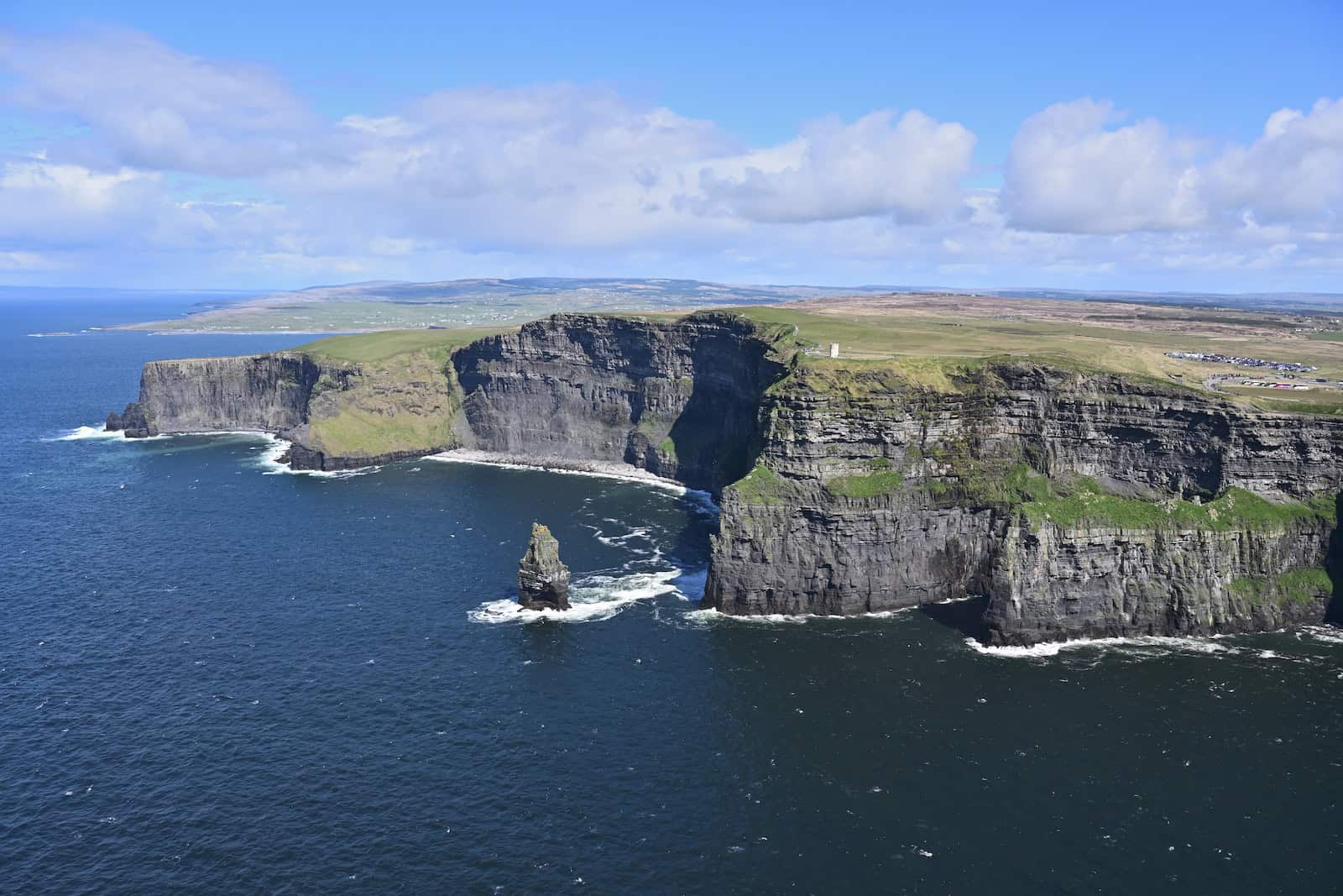 8:30: Arrive at the majestic Cliffs of Moher, which are located at the southwestern edge of the Burren region in County Clare. They reach their maximum height of 214 metres (702 feet) just north of O’Brien’s Tower, a round stone tower near the midpoint of the cliffs built in 1835 by Sir Cornelius O’Brien. From the Cliffs it is possible to see The Aran Islands in Galway Bay, and The Maumturks & Twelve Pins mountain ranges in County Galway.